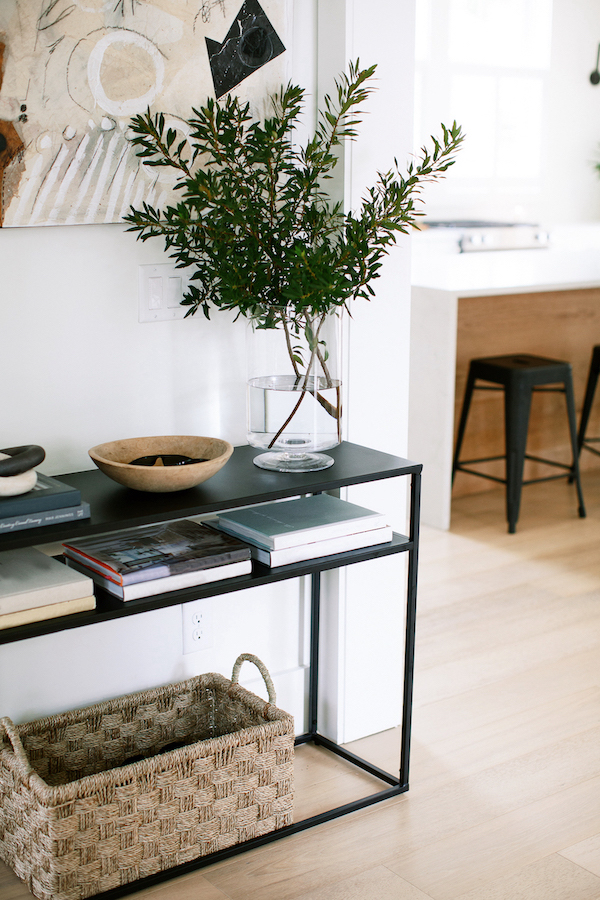 After finding the right piece, you might be wondering how to style a console table. Well, I think it’s important to consider both design and function. Console tables are a perfect place to keep keys, sunglasses, and other small items so a table with a drawer is great, or I like to use a small woven basket as a catch all.