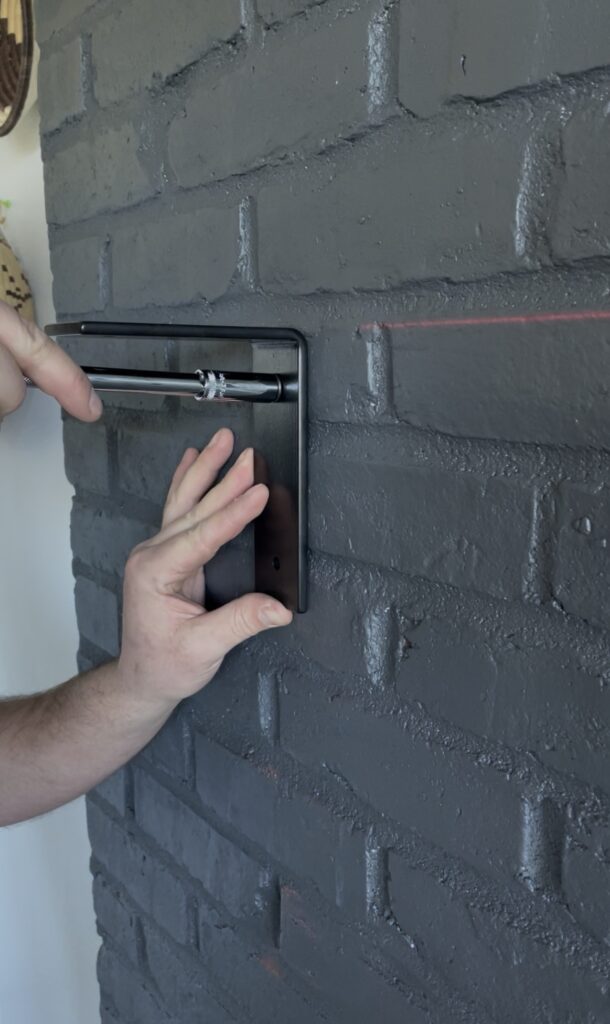 Then, we installed the heavy duty metal brackets to hold the wood beam. We used specialty fasteners, called masonry bolts, which are super strong and intended for brick.